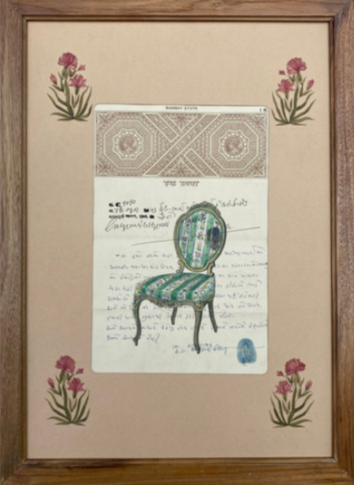 Between Presence and Absence 6 in this intricate 14 x 20-inch original, Parul Kaur utilizes a vintage "Bombay State" stamp paper as her canvas. The central subject is an elegant, high-backed armchair upholstered in soft green and white stripes with delicate floral details. The composition is framed by hand-painted pink floral sprigs in each corner of the mount, creating a soft, rhythmic border that complements the authoritative tone of the legal document beneath.
