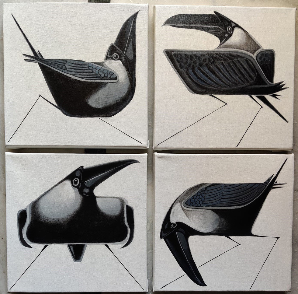 Four Crows is a Acrylic on Canvas artwork measuring 4 No.s Each 24X24 Inches. Cartoonist Shankar Pamarthy is known for surreal caricatures and portraits that capture the soul of his subjects without exaggeration. His pen‐and‐ink and acrylic works blend realistic features with dream‐like distortion and humour, reflecting a lifetime of sketching since childhood and a career in political cartooning