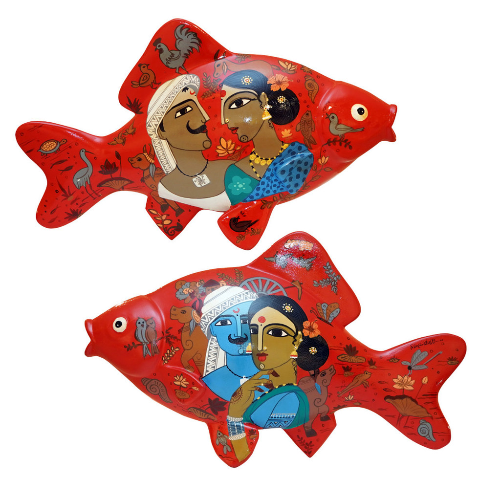 Rural Couple by Rajeshwar Nannuta portrays a symbolic duality—divine love and everyday companionship—through fish forms carrying Radha-Krishna and a village pair. The work reflects emotional depth, cultural grounding, and the shared rhythms of life across time and tradition.