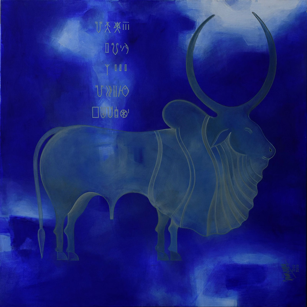 Artist Srinivasa Babu Angara’s works draw parallels between the Indus‐Saraswati civilisation and the present. He uses rusted metal, brass etchings and layered colour to give a rustic feel. Symbols like ancient seals and undeciphered scripts bridge India’s historical continuum, encouraging viewers to reconnect with ancient culture